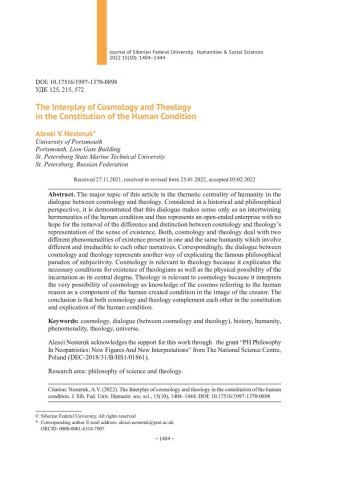 Библиографическое описание:Nesteruk, Alexei. The Interplay of Cosmology and Theology in the Constitution of the Human Condition = Взаимодополнительность космологии и теологии в конституции человеческого состояния / A. V. Nesteruk. - Текст : непосредственный // Журнал Сибирского федерального университета. Гуманитарные науки. - 2022. - Т. 15, № 10. - С. 1404-1444. - Библиогр.: с. 1443-1444. - ISSN 1997-1370.