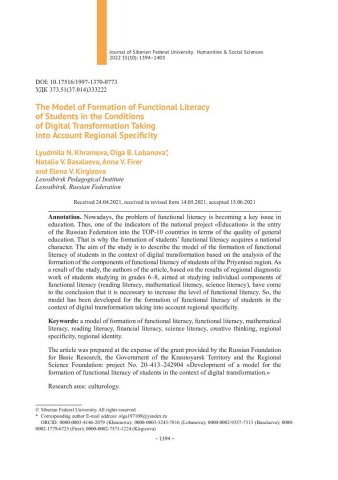 Библиографическое описание:The Model of Formation of Functional Literacy of Students in the Conditions of Digital Transformation Taking into Account Regional Specificity = Модель формирования функциональной грамотности обучающихся в условиях цифровой трансформации с учетом региональной специфики / L. N. Khramova, O. B. Lobanova, N. V. Basalaeva [et al.]. - Текст : непосредственный // Журнал Сибирского федерального университета. Гуманитарные науки. - 2022. - Т. 15, № 10. - С. 1394-1403. - Библиогр.: с. 1403. - ISSN 1997-1370.