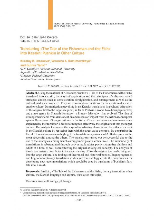 Библиографическое описание:Urazaeva, Kuralay. Translating "The Tale of the Fisherman and the Fish" into Kazakh: Pushkin in Other Culture = Казахские переводы "Сказки о рыбаке и рыбке": пушкинский текст в другой культуре / K. B. Urazaeva, V. A. Razumovskaya, Gulnur Yerik. - Текст : непосредственный // Журнал Сибирского федерального университета. Гуманитарные науки. - 2022. - Т. 15, № 2. - С. 187-203. - Библиогр.: с. 202-203. - ISSN 1997-1370.