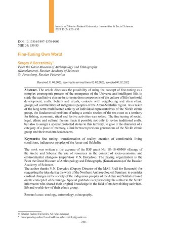 Аннотация: Показана возможность использования концепции о тонкой настройке как сложном космогоническом процессе возникновения Вселенной и разумной жизни для исследования качественного изменения некоторых современных компонентов культуры жизнедеятельности (освоение территории, промыслы, верования и ритуалы, контакты с соседними и пришлыми этносами) сообществ коренных народов Амуро-Cахалинского региона.
