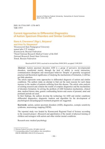 Библиографическое описание:Chereneva, Elena A... Current Approaches to Differential Diagnostics of Autism Spectrum Disorders and Similar Conditions = Актуальные подходы дифференциальной диагностики расстройств аутистического спектра и сходных состояний / E. A. Chereneva, O. L. Belyaeva, Irina Ya. Stoyanova. - Текст : непосредственный // Журнал Сибирского федерального университета. Гуманитарные науки. - 2022. - Т. 15, № 3. - С. 381-389. - Библиогр.: с. 387-389. - ISSN 1997-1370.