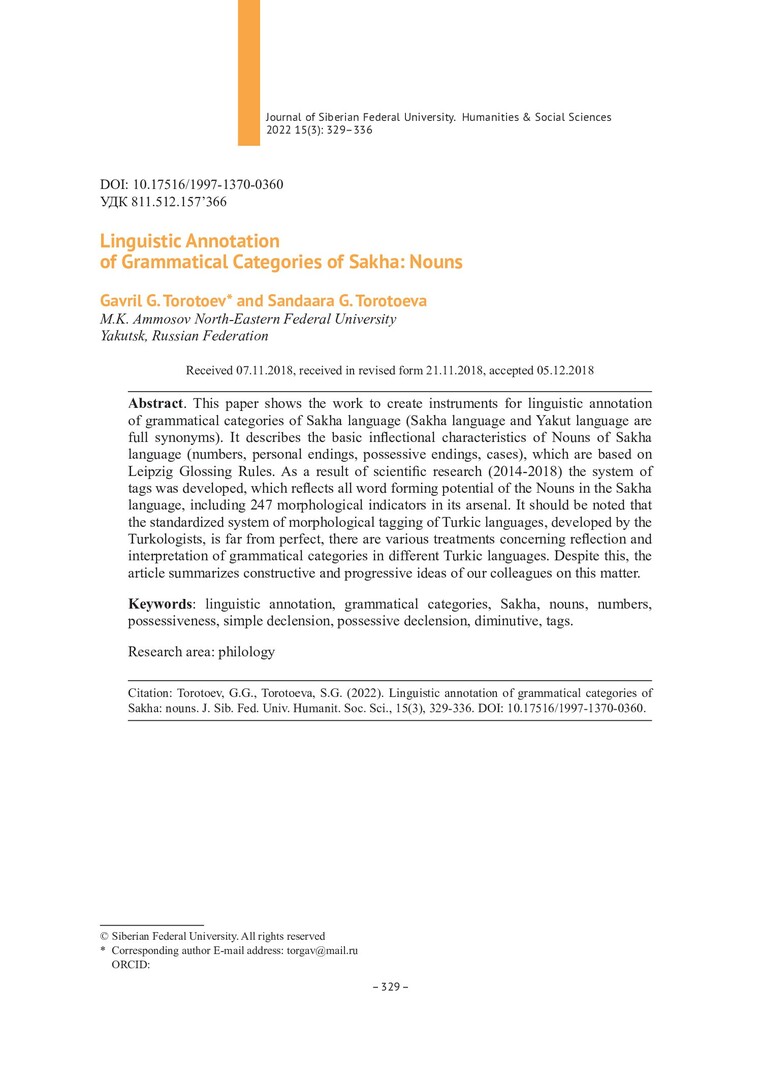 Библиографическое описание:Torotoev, Gavril. Linguistic Annotation of Grammatical Categories of Sakha: Nouns = Лингвистическое аннотирование грамматических категорий языка саха: имя существительное / G. G. Torotoev, S. G. Torotoeva. - Текст : непосредственный // Журнал Сибирского федерального университета. Гуманитарные науки. - 2022. - Т. 15, № 3. - С. 329-336. - Библиогр.: с. 335-336. - ISSN 1997-1370.