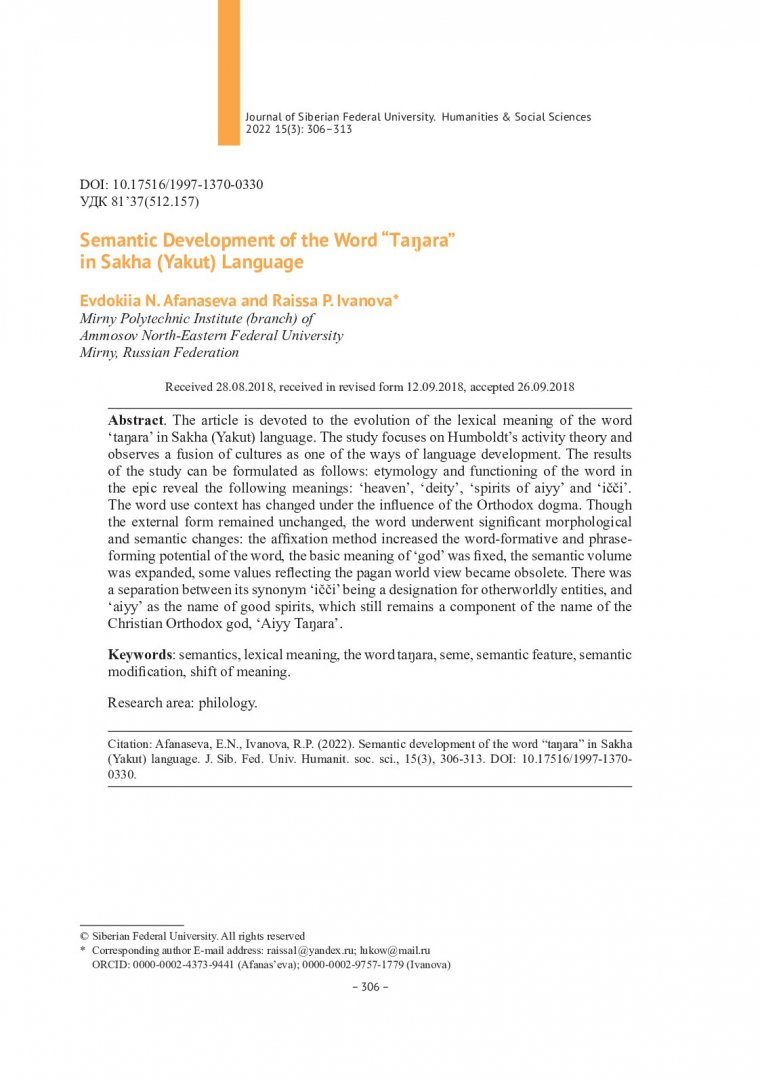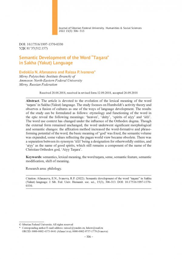 Библиографическое описание:Afanas`eva, Evdokiya. Semantic Development of the Word "Tаэнгмааra" in Sakha (Yakut) Language = Развитие семантики слова tаэнгмааra в якутском языке / E. N. Afanas`eva, R. P. Ivanova. - Текст : непосредственный // Журнал Сибирского федерального университета. Гуманитарные науки. - 2022. - Т. 15, № 3. - С. 306-313. - Библиогр.: с. 312-313. - ISSN 1997-1370.