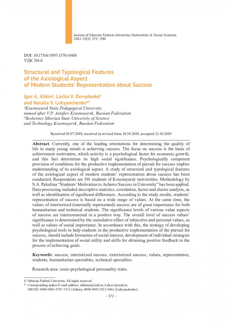 Библиографическое описание:Alikin, Igor. Structural and Typological Features of the Axiological Aspect of Modern Students` Representation about Success = Структурные и типологические особенности аксиологического аспекта представления современных студентов об успехе / I. A. Alikin, L. V. Dovydenko, N. V. Lukyanchenko. - Текст : непосредственный // Журнал Сибирского федерального университета. Гуманитарные науки. - 2022. - Т. 15, № 3. - С. 372-380. - Библиогр.: с. 378-380. - ISSN 1997-1370.