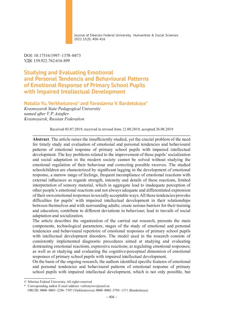 Библиографическое описание:Verkhoturova, Natalia. Studying and Evaluating Emotional and Personal Tendencis and Behavioural Patterns of Emotional Response of Primary School Pupils with Impaired Intellectual Development = Изучение и оценка эмоционально-личностных тенденций и поведенческого репертуара эмоционального реагирования учащихся младшего школьного возраста с нарушением интеллекта / Natalia Yu. Verkhoturova, Yaroslavna V. Bardetskaya. - Текст : непосредственный // Журнал Сибирского федерального университета. Гуманитарные науки. - 2022. - Т. 15, № 3. - С. 406-416. - Библиогр.: с. 413-416. - ISSN 1997-1370.
