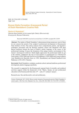 Библиографическое описание:Moskalyuk, Marina. Bronze Myths Formation. Krasnoyarsk Period of Dashi Namdakov`s Creative Path = Становление бронзовых мифов. Красноярский период творческого пути Даши Намдакова / M. V. Moskalyuk. - Текст : непосредственный // Журнал Сибирского федерального университета. Гуманитарные науки. - 2022. - Т. 15, № 4. - С. 494-502. - Библиогр.: с. 501-502. - ISSN 1997-1370.