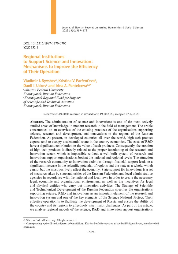 Библиографическое описание:Regional Institutions to Support Science and Innovation: Mechanisms to Improve the Efficiency of Their Operation = Региональные институты поддержки науки и инноваций: механизмы повышения эффективности их функционирования / V. I. Byvshev, K. V. Parfent`eva, D. I. Uskov, I. A. Panteleeva. - Текст : непосредственный // Журнал Сибирского федерального университета. Гуманитарные науки. - 2022. - Т. 15, № 4. - С. 559-579. - Библиогр.: с. 574-579. - ISSN 1997-1370.