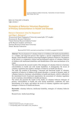 Библиографическое описание:Chereneva, Elena. Strategies of Behavior Voluntary Regulation of Primary Schoolchildren in Health and Disease = Стратегии произвольной регуляции поведения у детей младшего школьного возраста в норме и патологии / E. A. Chereneva, Irina Ya. Stoyanova, O. L. Belyaeva. - Текст : непосредственный // Журнал Сибирского федерального университета. Гуманитарные науки. - 2022. - Т. 15, № 4. - С. 526-536. - Библиогр.: с. 534-536. - ISSN 1997-1370.