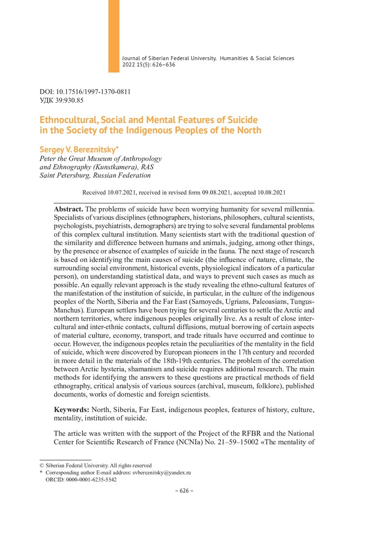 Библиографическое описание:Bereznitsky, Sergey. Ethnocultural, Social and Mental Features of Suicide in the Society of the Indigenous Peoples of the North = Этнокультурные, социальные и ментальные особенности суицида в обществе коренных народов Севера / S. V. Bereznitsky. - Текст : непосредственный // Журнал Сибирского федерального университета. Гуманитарные науки. - 2022. - Т. 15, № 5. - С. 626-636. - Библиогр.: с. 633-636. - ISSN 1997-1370.