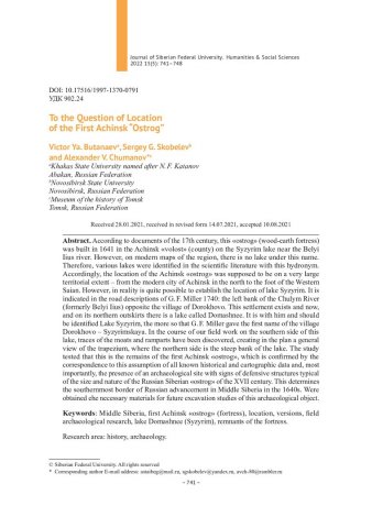 Библиографическое описание:Бутанаев, Виктор. К вопросу о месте нахождения первого Ачинского острога = To the Question of Location of the First Achinsk “Ostrog” / В. Я. Бутанаев, С. Г. Скобелев, А. В. Чуманов. - Текст : непосредственный // Журнал Сибирского федерального университета. Гуманитарные науки. - 2022. - Т. 15, № 5. - С. 741-748. - Библиогр.: с. 747-748. - ISSN 1997-1370.