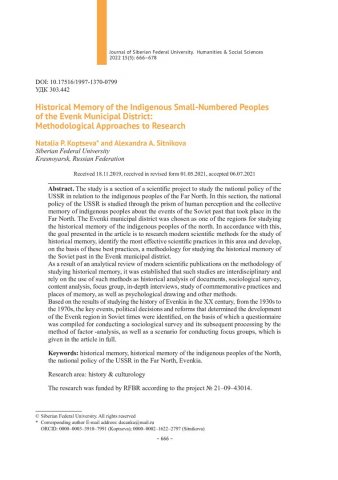 Библиографическое описание:Копцева, Наталия. Историческая память коренных малочисленных народов Эвенкийского муниципального района: методологические подходы к исследованию = Historical Memory of the Indigenous Small-Numbered Peoples of the Evenk Municipal District: Methodological Approaches to Research / Н. П. Копцева, А. А. Ситникова. - Текст : непосредственный // Журнал Сибирского федерального университета. Гуманитарные науки. - 2022. - Т. 15, № 5. - С. 666-678. - Библиогр.: с. 676-678. - ISSN 1997-1370.