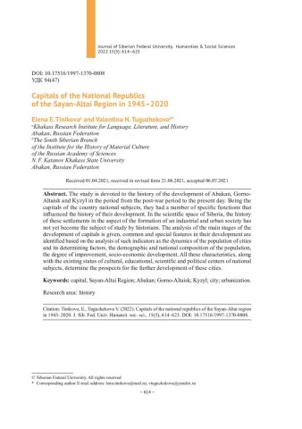 Библиографическое описание:Тиникова, Елена. Столицы национальных республик Саяно-Алтайского региона в 1945–2020 гг. = Capitals of the National Republics of the Sayan-Altai Region in 1945–2020 / Е. Е. Тиникова, В. Н. Тугужекова. - Текст : непосредственный // Журнал Сибирского федерального университета. Гуманитарные науки. - 2022. - Т. 15, № 5. - С. 614-623. - Библиогр.: с. 623. - ISSN 1997-1370.