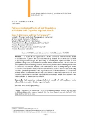 Библиографическое описание:Черенева, Елена. Патопсихологическая модель саморегуляции у детей с нарушением когнитивного здоровья = Pathopsychological Model of Self-Regulation in Children with Cognitive Impaired Health / Е. А. Черенева, И. Я. Стоянова. - Текст : непосредственный // Журнал Сибирского федерального университета. Гуманитарные науки. - 2022. - Т. 15, № 5. - С. 637-651. - Библиогр.: с. 649-651. - ISSN 1997-1370.