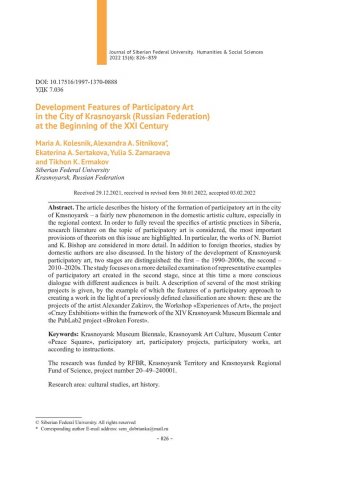 Библиографическое описание:Особенности развития партиципаторного искусства в городе Красноярске (Российская Федерация) в начале XXI века = Development Features of Participatory Art in the City of Krasnoyarsk (Russian Federation) at the Beginning of the XXI Century / М. А. Колесник, А. А. Ситникова, Е. А. Сертакова [и др.]. - Текст : непосредственный // Журнал Сибирского федерального университета. Гуманитарные науки. - 2022. - Т. 15, № 6. - С. 826-839. - Библиогр.: с. 837-839. - ISSN 1997-1370.