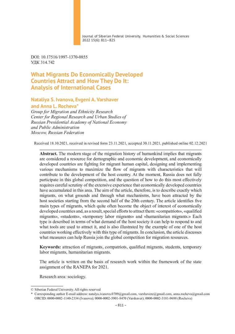 Библиографическое описание:Иванова, Наталья. Каких мигрантов привлекают экономически развитые страны и как они это делают: анализ международного опыта = What Migrants Do Economically Developed Countries Attract and How They Do It: Analysis of International Cases / Н. С. Иванова, Е. А. Варшавер, А. Л. Рочева. - Текст : непосредственный // Журнал Сибирского федерального университета. Гуманитарные науки. - 2022. - Т. 15, № 6. - С. 811-825. - Библиогр.: с. 824-825. - ISSN 1997-1370.