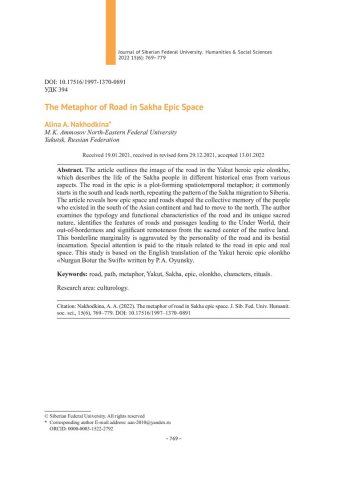 Библиографическое описание:Nakhodkina, Alina. The Metaphor of Road in Sakha Epic Space = Метафора дороги в эпическом пространстве саха / A. A. Nakhodkina. - Текст : непосредственный // Журнал Сибирского федерального университета. Гуманитарные науки. - 2022. - Т. 15, № 6. - С. 769-779. - Библиогр.: с. 778-779. - ISSN 1997-1370.