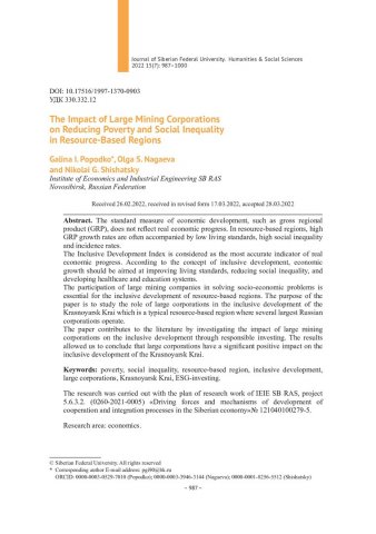 Библиографическое описание:Поподько, Галина. Роль крупных компаний в снижении бедности и социального неравенства населения ресурсного региона = The Impact of Large Mining Corporations on Reducing Poverty and Social Inequality in Resource-Based Regions / Г. И. Поподько, О. С. Нагаева, Н. Г. Шишацкий. - Текст : непосредственный // Журнал Сибирского федерального университета. Гуманитарные науки. - 2022. - Т. 15, № 7. - С. 987-1000. - Библиогр.: с. 999-1000. - ISSN 1997-1370.