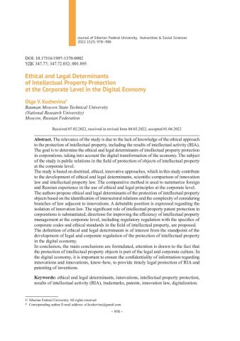 Библиографическое описание:Кожевина, Ольга. Этико-правовые детерминанты охраны интеллектуальной собственности на корпоративном уровне в цифровой экономике = Ethical and Legal Determinants of Intellectual Property Protection at the Corporate Level in the Digital Economy / О. В. Кожевина. - Текст : непосредственный // Журнал Сибирского федерального университета. Гуманитарные науки. - 2022. - Т. 15, № 7. - С. 978-986. - Библиогр.: с. 986. - ISSN 1997-1370.