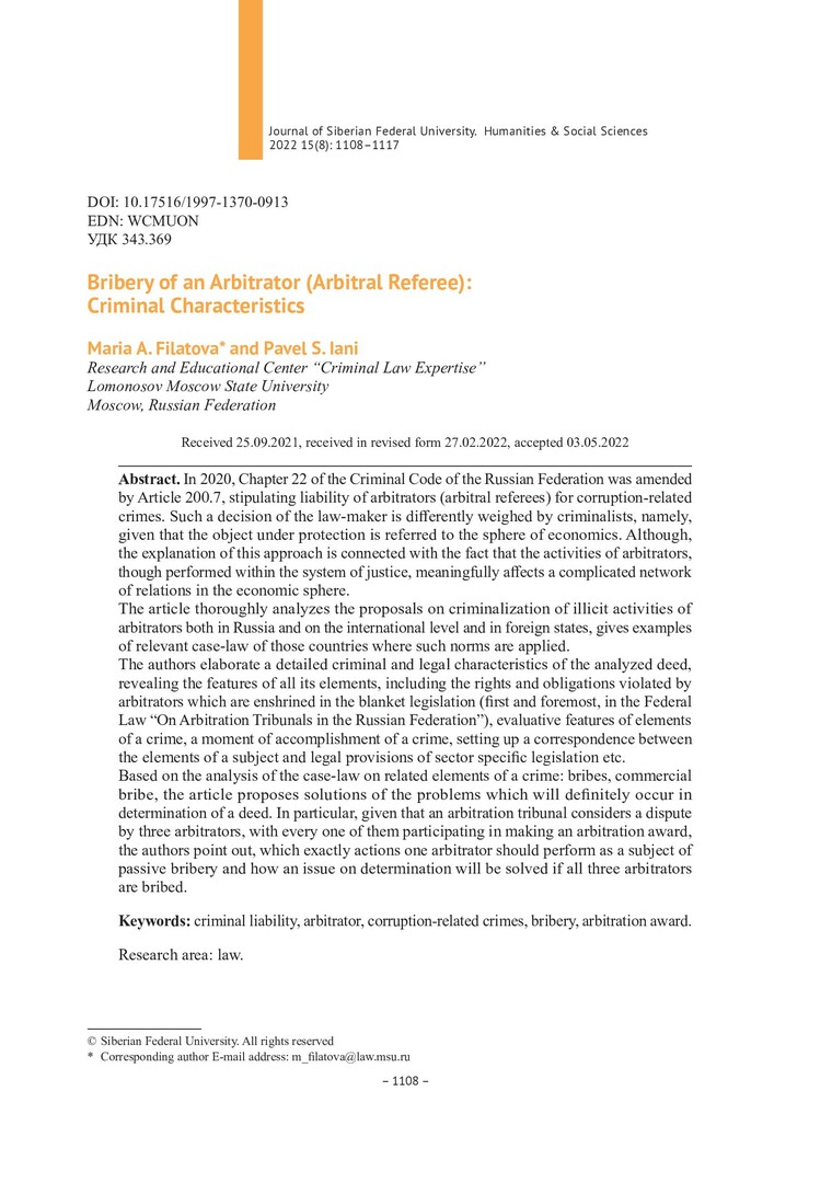 Библиографическое описание:Filatova, Maria. Bribery of an Arbitrator (Arbitral Referee): Criminal Characteristics = Подкуп арбитра (третейского судьи): уголовно-правовая характеристика / M. A. Filatova, P. S. Iani. - Текст : непосредственный // Журнал Сибирского федерального университета. Гуманитарные науки. - 2022. - Т. 15, № 8. - С. 1108-1117. - Библиогр.: с. 1117. - ISSN 1997-1370.
