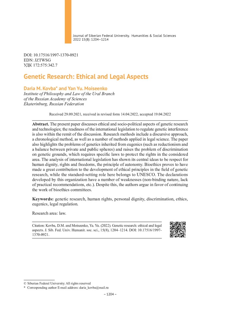 Библиографическое описание:Kovba, Daria. Genetic Research: Ethical and Legal Aspects = Генетические исследования: этические и правовые аспекты / D. M. Kovba, Yan Yu. Moiseenko. - Текст : непосредственный // Журнал Сибирского федерального университета. Гуманитарные науки. - 2022. - Т. 15, № 8. - С. 1204-1214. - Библиогр.: с. 1213-1214. - ISSN 1997-1370.