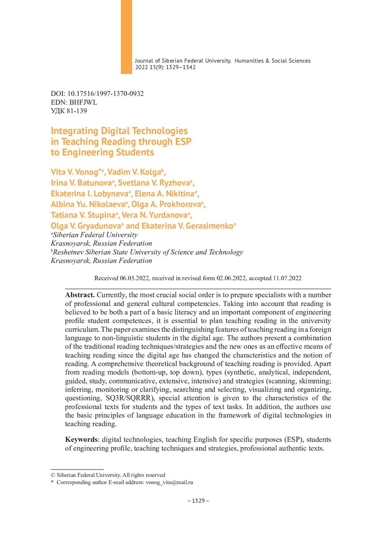 Библиографическое описание: Integrating Digital Technologies in Teaching Reading through ESP to Engineering Students = Интеграция цифровых технологий в профессионально-ориентированное обучение чтению студентов инженерных направлений / V. V. Vonog, V. V. Kolga, I. V. Batunova [et al.]. - Текст : непосредственный // Журнал Сибирского федерального университета. Гуманитарные науки. - 2022. - Т. 15, № 9. - С. 1329-1342. - Библиогр.: с. 1340-1342. - ISSN 1997-1370.