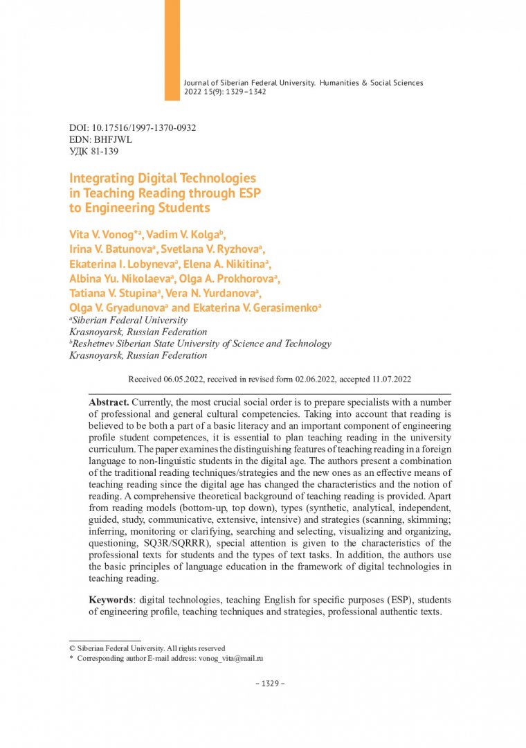 Integrating Digital Technologies in Teaching Reading through ESP to Engineering Studentsстатья из журнала