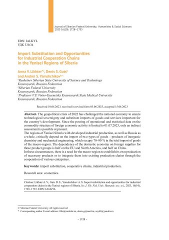Библиографическое описание:Лихтер, А. В. Импортозамещение и возможности развития промышленных кооперационных цепочек в регионах Енисейской Сибири = Import Substitution and Opportunities for Industrial Cooperation Chains in the Yenisei Regions of Siberia / А. В. Лихтер, Д. С. Гуц, А. С. Ямщиков. - Текст : непосредственный // Журнал Сибирского федерального университета. Гуманитарные науки. - 2023. - Т. 16, № 10. - С. 1728-1735. - Библиогр.: с. 1735. - ISSN 1997-1370.