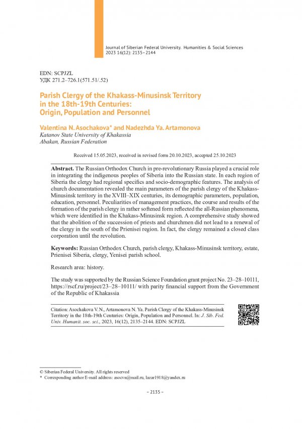 Библиографическое описание:Asochakova, Valentina. Parish Clergy of the Khakass-Minusinsk Territory in the 18th-19th Centuries: Origin, Population and Personnel = Приходское духовенство Хакасско- Минусинского края в XVIII–XIX вв.: происхождение, численность, личный состав / V. N. Asochakova, Nadezhda Ya. Artamonova. - Текст : непосредственный // Журнал Сибирского федерального университета. Гуманитарные науки. - 2023. - Т. 16, № 12. - С. 2135-2144. - Библиогр.: с. 2143-2144. - ISSN 1997-1370.