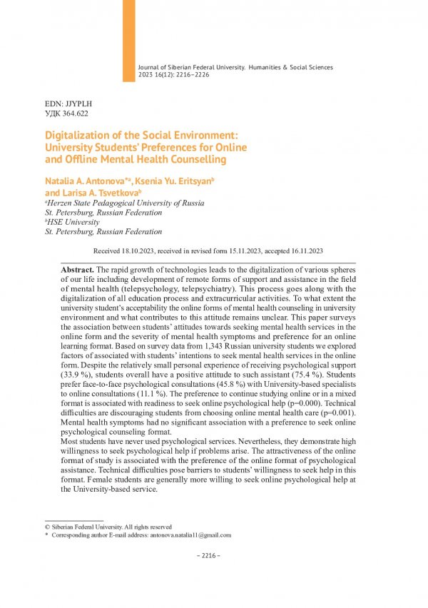 Библиографическое описание:Antonova, Natalia. Digitalization of the Social Environment: University Student`s Preferences for Online and Offline Mental Health Counselling = Цифровизация социальной среды: предпочтения студентов университетов в отношении онлайн- и офлайн-консультирования по психическому здоровью / N. A. Antonova, Ksenia Yu. Eritsyan, L. A. Tsvetkova. - Текст : непосредственный // Журнал Сибирского федерального университета. Гуманитарные науки. - 2023. - Т. 16, № 12. - С. 2216-2226. - Библиогр.: с. 2224-2226. - ISSN 1997-1370.