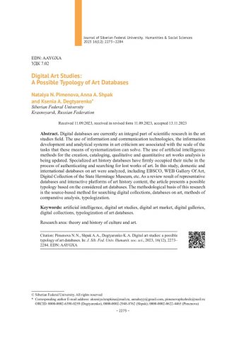 Библиографическое описание: Пименова, Н. Н. Цифровое искусствознание: возможная типология баз данных по искусству = Digital Art Studies: A Possible Typology of Art Databases / Н. Н. Пименова, А. А. Шпак, К. А. Дегтяренко. - Текст : непосредственный // Журнал Сибирского федерального университета. Гуманитарные науки. - 2023. - Т. 16, № 12. - С. 2273-2284. - Библиогр.: с. 2282-2284. - ISSN 1997-1370.
