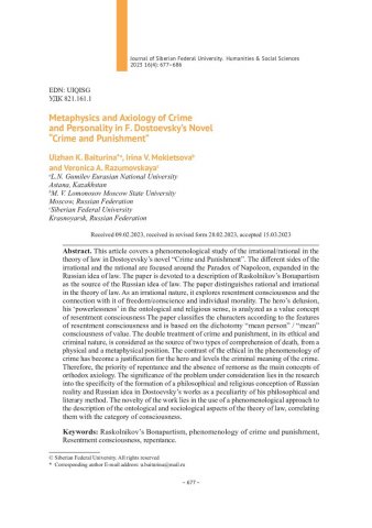 Библиографическое описание:Baiturina, Ulzhan. Metaphysics and Axiology of Crime and Personality in F. Dostoevsky`s Novel "Crime and Punishment" = Метафизика и аксиология преступления и личности в романе Ф. Достоевского "Преступление и наказание" / U. K. Baiturina, I. V. Mokletsova, V. A. Razumovskaya. - Текст : непосредственный // Журнал Сибирского федерального университета. Гуманитарные науки. - 2023. - Т. 16, № 4. - С. 677-686. - Библиогр.: с. 685-686. - ISSN 1997-1370.
