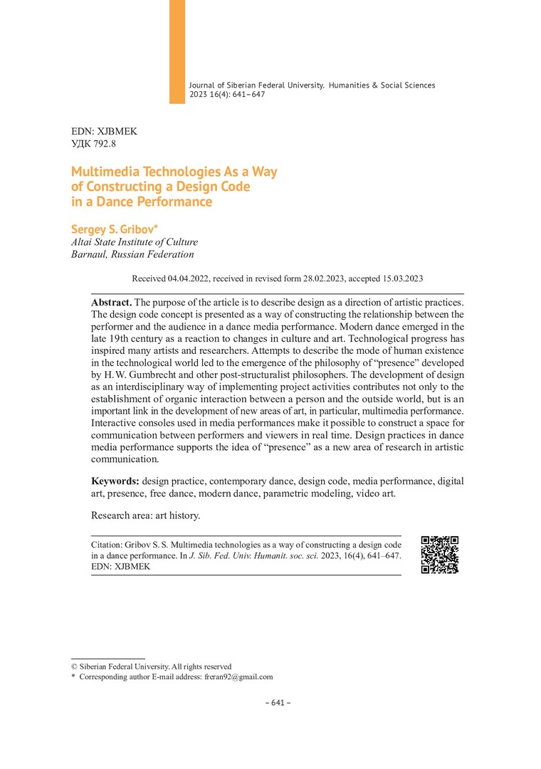 Аннотация:В статье рассмотрена концепция дизайн-кода как особого вида проектной деятельности, практики, способствующей конструированию коммуникативного пространства в танцевальном медиаперформансе.