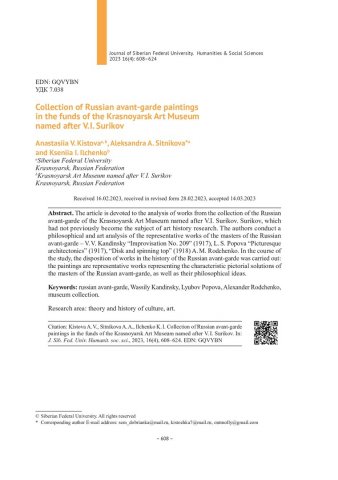 Библиографическое описание:Кистова, А. В. Коллекция живописи русского авангарда в фондах Красноярского художественного музея им. В. И. Сурикова = Collection of Russian avant-garde paintings in the funds of the Krasnoyarsk Art Museum named after V. I. Surikov / А. В. Кистова, А. А. Ситникова, К. И. Ильченко. - Текст : непосредственный // Журнал Сибирского федерального университета. Гуманитарные науки. - 2023. - Т. 16, № 4. - С. 608-624. - Библиогр.: с. 622-624. - ISSN 1997-1370.