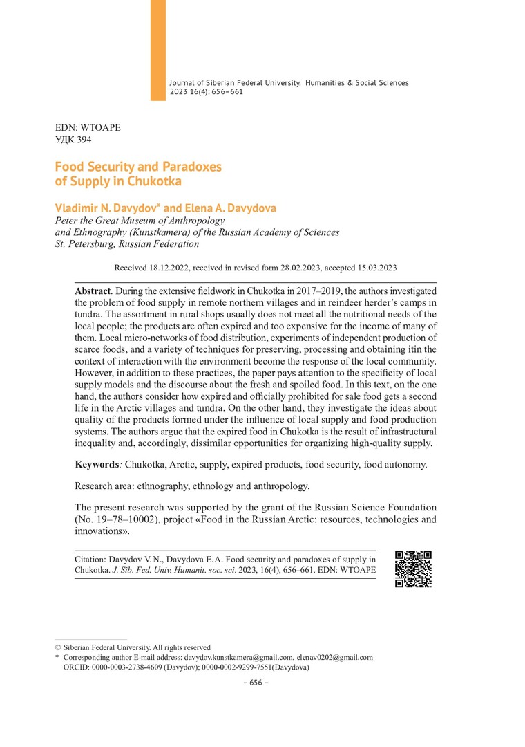 Аннотация:Опираясь на полевые материалы, собранные в ходе четырех экспедиций на Чукотку в 2017–2022 гг., авторы исследуют проблему обеспечения продовольствием отдаленных северных поселков и оленеводческих стойбищ в тундре.