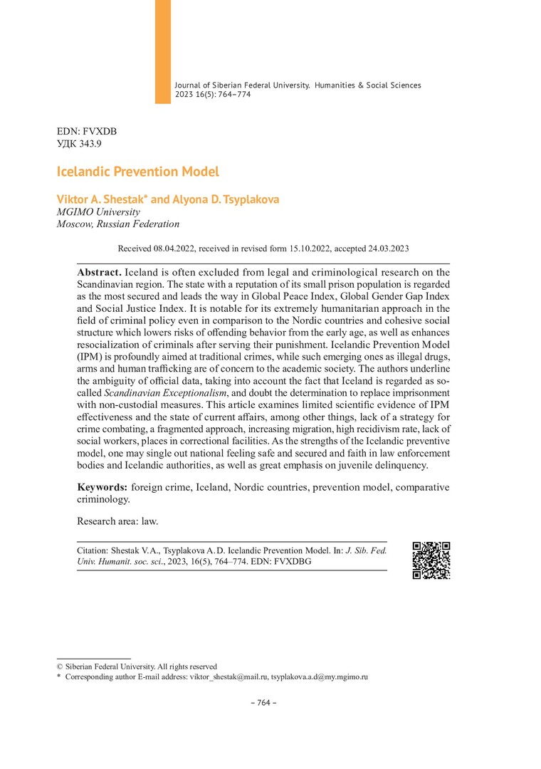 Библиографическое описание:Shestak, Viktor. Icelandic Prevention Model = Исландская модель профилактики / V. A. Shestak, A. D. Tsyplakova. - Текст : непосредственный // Журнал Сибирского федерального университета. Гуманитарные науки. - 2023. - Т. 16, № 5. - С. 764-774. - Библиогр.: с. 772-774. - ISSN 1997-1370.