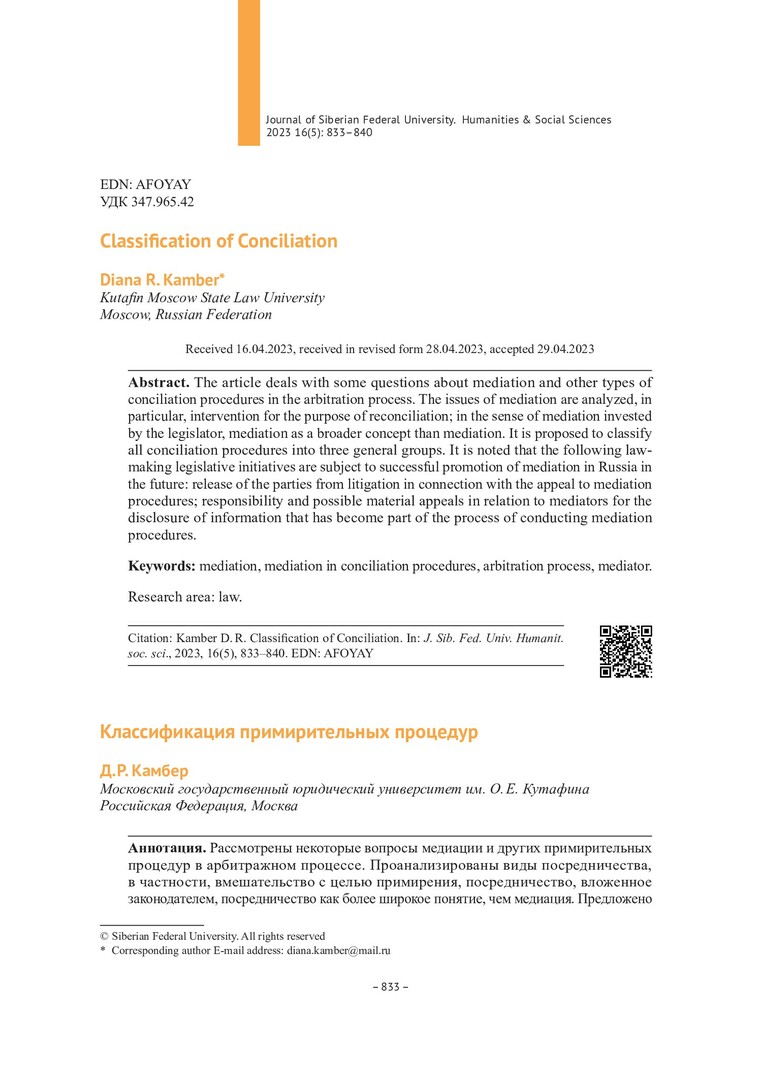 Библиографическое описание:Камбер, Д. Р. Классификация примирительных процедур = Classification of Conciliation / Д. Р. Камбер. - Текст : непосредственный // Журнал Сибирского федерального университета. Гуманитарные науки. - 2023. - Т. 16, № 5. - С. 833-840. - Библиогр.: с. 839-840. - ISSN 1997-1370.