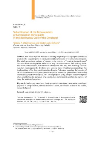 Библиографическое описание:Shishmareva, Tatiana. Subordination of the Requirements of Construction Participants in the Bankruptcy Case of the Developer = Субординация требований участников строительства в деле о банкротстве застройщика / T. P. Shishmareva, E. E. En’kova. - Текст : непосредственный // Журнал Сибирского федерального университета. Гуманитарные науки. - 2023. - Т. 16, № 5. - С. 775-782. - Библиогр.: с. 781-782. - ISSN 1997-1370.