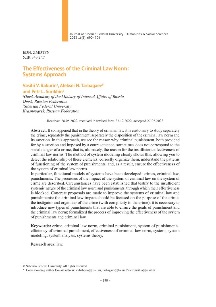 Библиографическое описание: Бабурин, В. В. Эффективность уголовно-правовой нормы: системный подход = The Effectiveness of the Criminal Law Norm: Systems Approach / В. В. Бабурин, А. Н. Тарбагаев, П. Л. Сурихин. - Текст : непосредственный // Журнал Сибирского федерального университета. Гуманитарные науки. - 2023. - Т. 16, № 5. - С. 690-704. - Библиогр.: с. 703-704. - ISSN 1997-1370.
