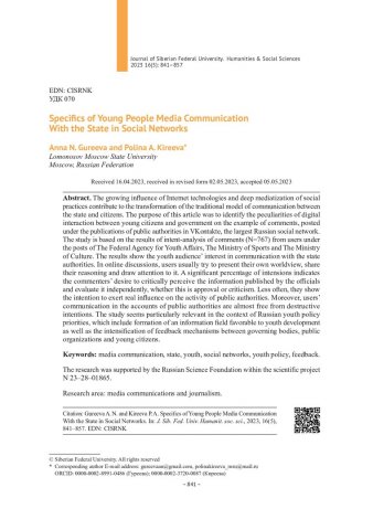 Библиографическое описание:Гуреева, А. Н. Особенности медиакоммуникации молодежи с государством в социальных сетях = Specifics of Young People Media Communication With the State in Social Networks / А. Н. Гуреева, П. А. Киреева. - Текст : непосредственный // Журнал Сибирского федерального университета. Гуманитарные науки. - 2023. - Т. 16, № 5. - С. 841-857. - Библиогр.: с. 855-857. - ISSN 1997-1370.
