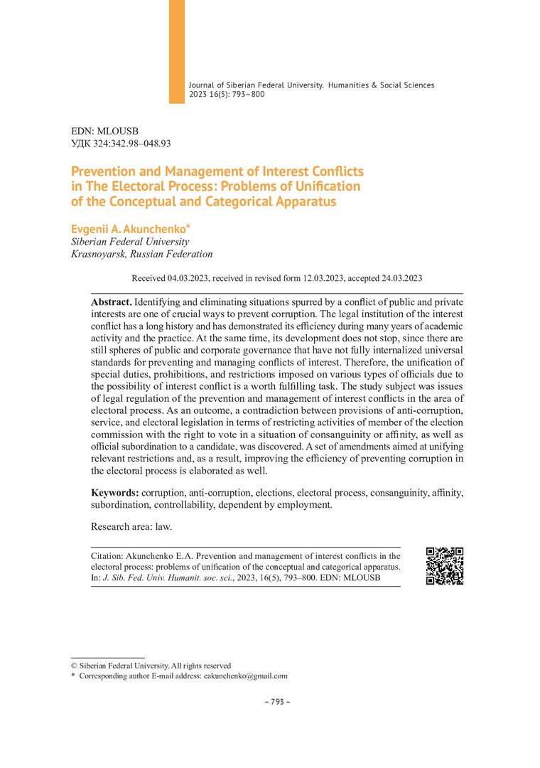 Библиографическое описание:Акунченко, Е. А. Предотвращение и урегулирование конфликта интересов в избирательном процессе: проблемы унификации понятийно-категориального аппарата = Prevention and Management of Interest Conflicts in The Electoral Process: Problems of Unification of the Conceptual and Categorical Apparatus / Е. А. Акунченко. - Текст : непосредственный // Журнал Сибирского федерального университета. Гуманитарные науки. - 2023. - Т. 16, № 5. - С. 793-800. - Библиогр.: с. 799-800. - ISSN 1997-1370.