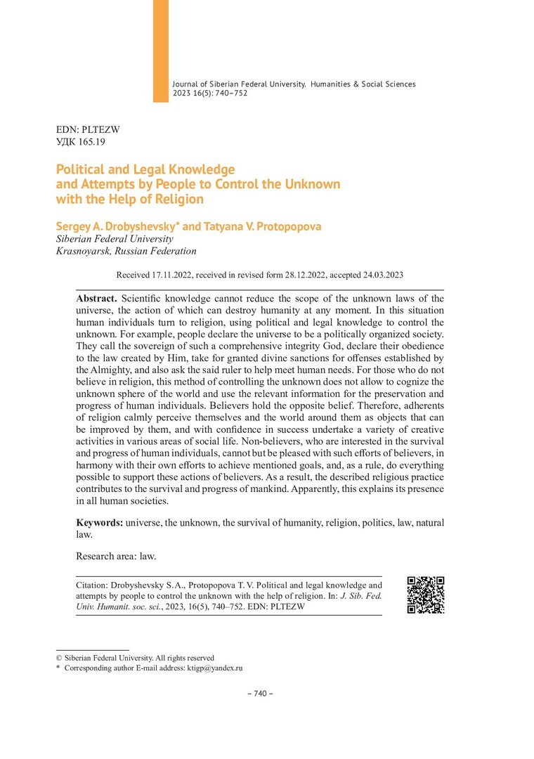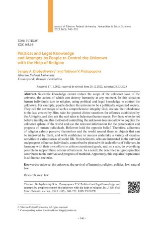 Библиографическое описание:Дробышевский, C. А. Политико-правовое знание и попытки контроля людьми непознанного с помощью религии = Political and Legal Knowledge and Attempts by People to Control the Unknown with the Help of Religion / C. А. Дробышевский, Т. В. Протопопова, T. V. Protopopovа. - Текст : непосредственный // Журнал Сибирского федерального университета. Гуманитарные науки. - 2023. - Т. 16, № 5. - С. 740-752. - Библиогр.: с. 751-752. - ISSN 1997-1370.