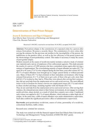 Библиографическое описание:Darkhanova, Aruna. Determinantes of Post-Prison Relapse = Причины постпенитенциарного рецидива преступлений / A. B. Darkhanova, O. V. Filippova. - Текст : непосредственный // Журнал Сибирского федерального университета. Гуманитарные науки. - 2023. - Т. 16, № 5. - С. 801-808. - Библиогр.: с. 807-808. - ISSN 1997-1370.