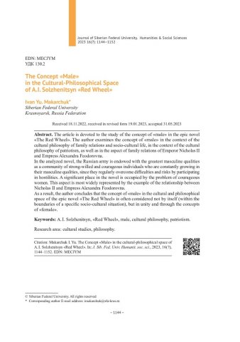 Библиографическое описание:Макарчук, И. Ю. Концепт "мужское" в культурфилософском пространстве романа-эпопеи А. И. Солженицына "Красное колесо" = The Concept "Male" in the Cultural-Philosophical Space of A. I. Solzhenitsyn "Red Wheel" / И. Ю. Макарчук. - Текст : непосредственный // Журнал Сибирского федерального университета. Гуманитарные науки. - 2023. - Т. 16, № 7. - С. 1144-1152. - Библиогр.: с. 1150-1152. - ISSN 1997-1370.