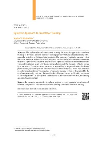 Библиографическое описание:Сдобников, В. В. Системный подход к подготовке переводчиков = Systemic Approach to Translator Training / В. В. Сдобников. - Текст : непосредственный // Журнал Сибирского федерального университета. Гуманитарные науки. - 2023. - Т. 16, № 7. - С. 1153-1164. - Библиогр.: с. 1162-1164. - ISSN 1997-1370.