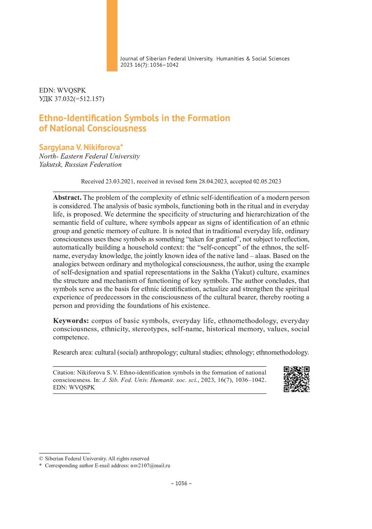 Библиографическое описание:Nikiforova, Sargylana. Ethno-Identification Symbols in the Formation of National Consciousness = Этноидентификационные символы в формировании национального самосознания / S. V. Nikiforova. - Текст : непосредственный // Журнал Сибирского федерального университета. Гуманитарные науки. - 2023. - Т. 16, № 7. - С. 1036-1042. - Библиогр.: с. 1041-1042. - ISSN 1997-1370.