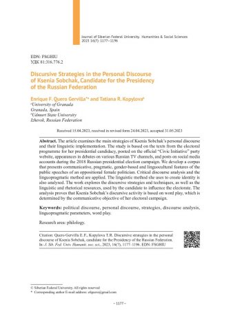 Библиографическое описание:Enrique F. Quero Gervilla. Discursive Strategies in the Personal Discourse of Ksenia Sobchak, Candidate for the Presidency of the Russian Federation = Дискурсивные стратегии в политическом дискурсе Ксении Собчак, кандидата в президенты Российской Федерации / Enrique F. Quero Gervilla, T. R. Kopylova. - Текст : непосредственный // Журнал Сибирского федерального университета. Гуманитарные науки. - 2023. - Т. 16, № 7. - С. 1177-1196. - Библиогр.: с. 1195-1196. - ISSN 1997-1370.