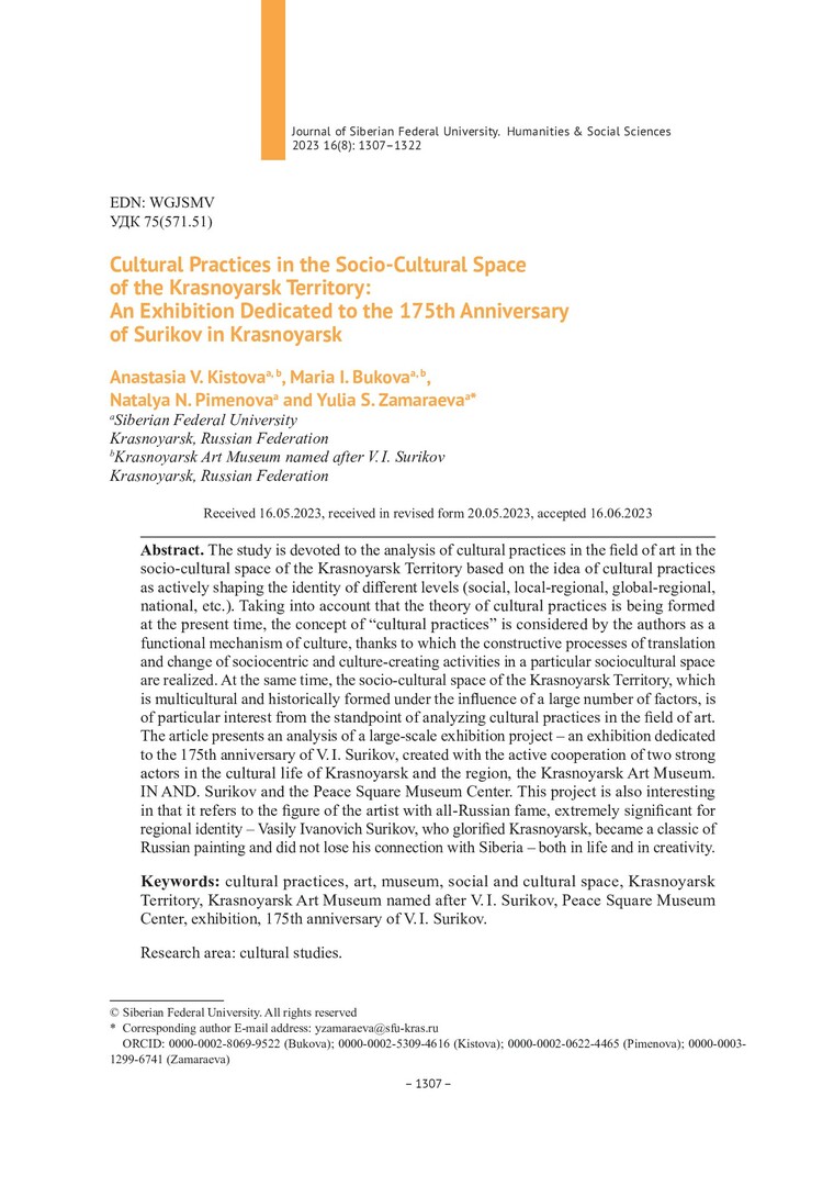 Библиографическое описание:Культурные практики в социально-культурном пространстве Красноярского края: выставка к 175-летию Сурикова в Красноярске = Cultural Practices in the Socio-Cultural Space of the Krasnoyarsk Territory: An Exhibition Dedicated to the 175th Anniversary of Surikov in Krasnoyarsk / А. В. Кистова, М. И. Букова, Н. Н. Пименова, Ю. С. Замараева. - Текст : непосредственный // Журнал Сибирского федерального университета. Гуманитарные науки. - 2023. - Т. 16, № 8. - С. 1307-1322. - Библиогр.: с. 1318-1322. - ISSN 1997-1370.