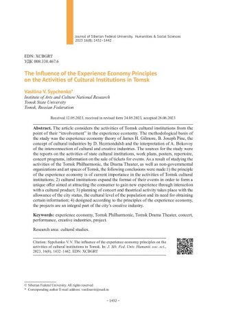 Библиографическое описание:Сыпченко, В. В. Влияние принципов экономики впечатлений на деятельность учреждений культуры Томска = The Influence of the Experience Economy Principles on the Activities of Cultural Institutions in Tomsk / В. В. Сыпченко. - Текст : непосредственный // Журнал Сибирского федерального университета. Гуманитарные науки. - 2023. - Т. 16, № 8. - С. 1432-1442. - Библиогр.: с. 1440-1442. - ISSN 1997-1370.