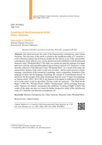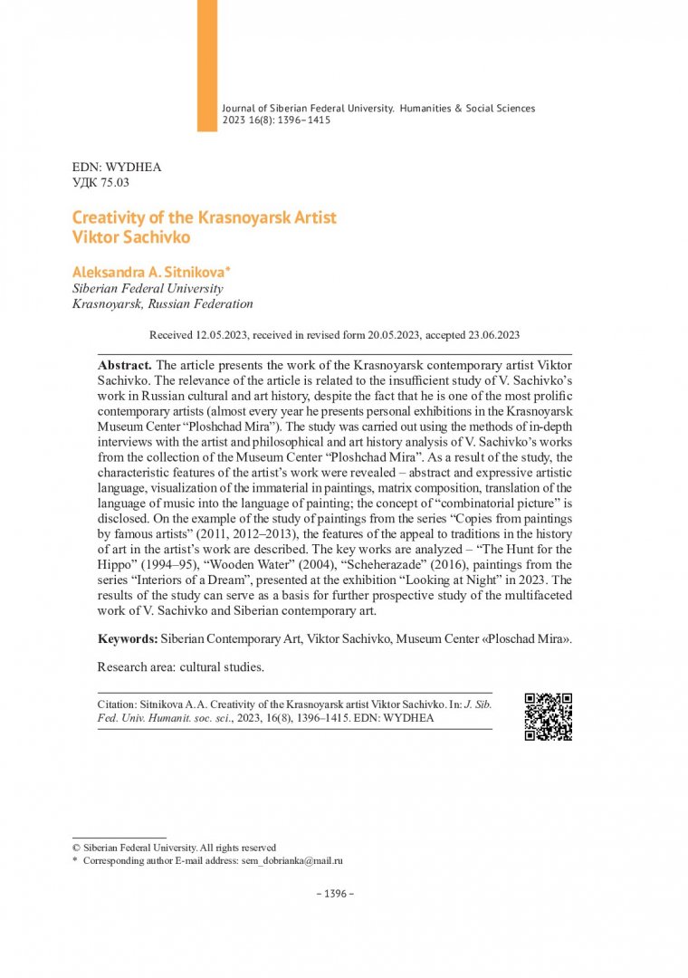 Библиографическое описание:Ситникова, А. А. Творчество красноярского художника Виктора Сачивко = Creativity of the Krasnoyarsk Artist Viktor Sachivko / А. А. Ситникова. - Текст : непосредственный // Журнал Сибирского федерального университета. Гуманитарные науки. - 2023. - Т. 16, № 8. - С. 1396-1415. - Библиогр.: с. 1412-1415. - ISSN 1997-1370.