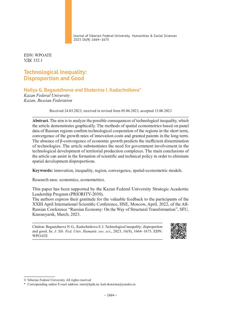 Библиографическое описание:Bagautdinova, Nailya. Technological Inequality: Disproportion and Good = Технологическое неравенство: диспропорция и благо / N. G. Bagautdinova, E. I. Kadochnikova. - Текст : непосредственный // Журнал Сибирского федерального университета. Гуманитарные науки. - 2023. - Т. 16, № 9. - С. 1664-1675. - Библиогр.: с. 1674-1675 . - ISSN 1997-1370.